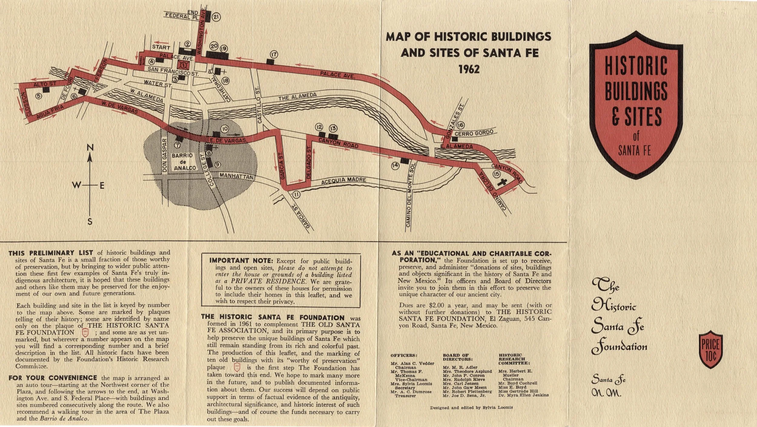 I find myself frequently consulting the original board minutes of the Foundation for my own orientation of how we came to be where we are now are. February 1962 is the first discussion of preliminary list of properties to be “marked” by the Foundation. In March 1962, there is a rough draft of the pamphlet with a map and key. In May 1962, the budget estimate for the printing is given as $36.00 for artwork, and a total of $225 for the entire project. A draft press release announcing the publication of Historic Buildings and Sites of Santa Fe is dated July 29, 1962, and, by September, it is reported that over 1600 pamphlets have been sold, generating many visitors to El Zaguán.