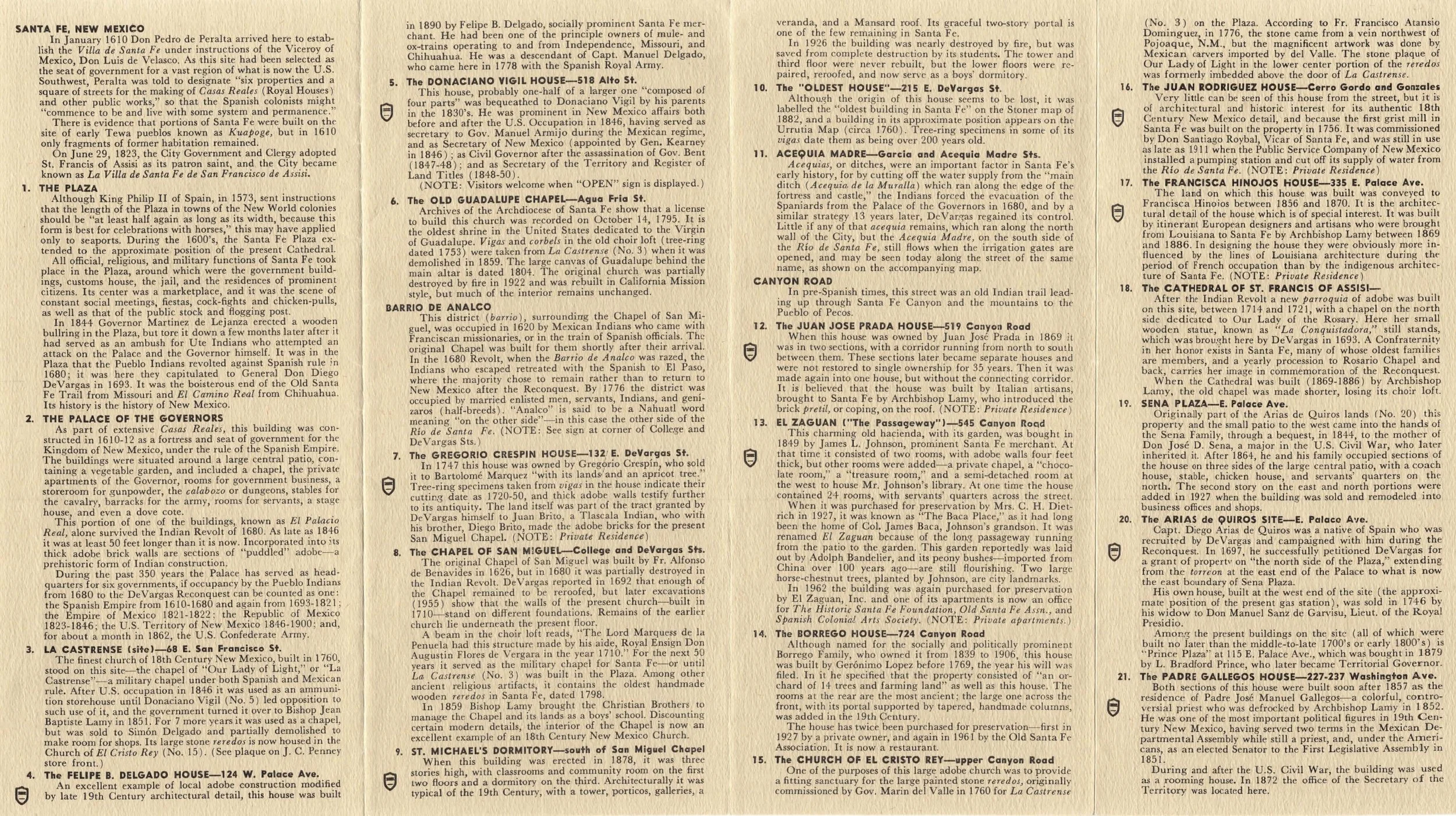 Enjoy this electronic version of the first publication by the Historic Santa Fe Foundation, and think of it when you have the new edition of Old Santa Fe Today in hand. The #13 entry in the pamphlet states that one of the apartments at El Zaguán “…is now an office for The Historic Santa Fe Foundation, Old Santa Fe Assn., Spanish Colonial Arts Society.” One office for these three entities. I do hope they rotated their time in there in 1962.