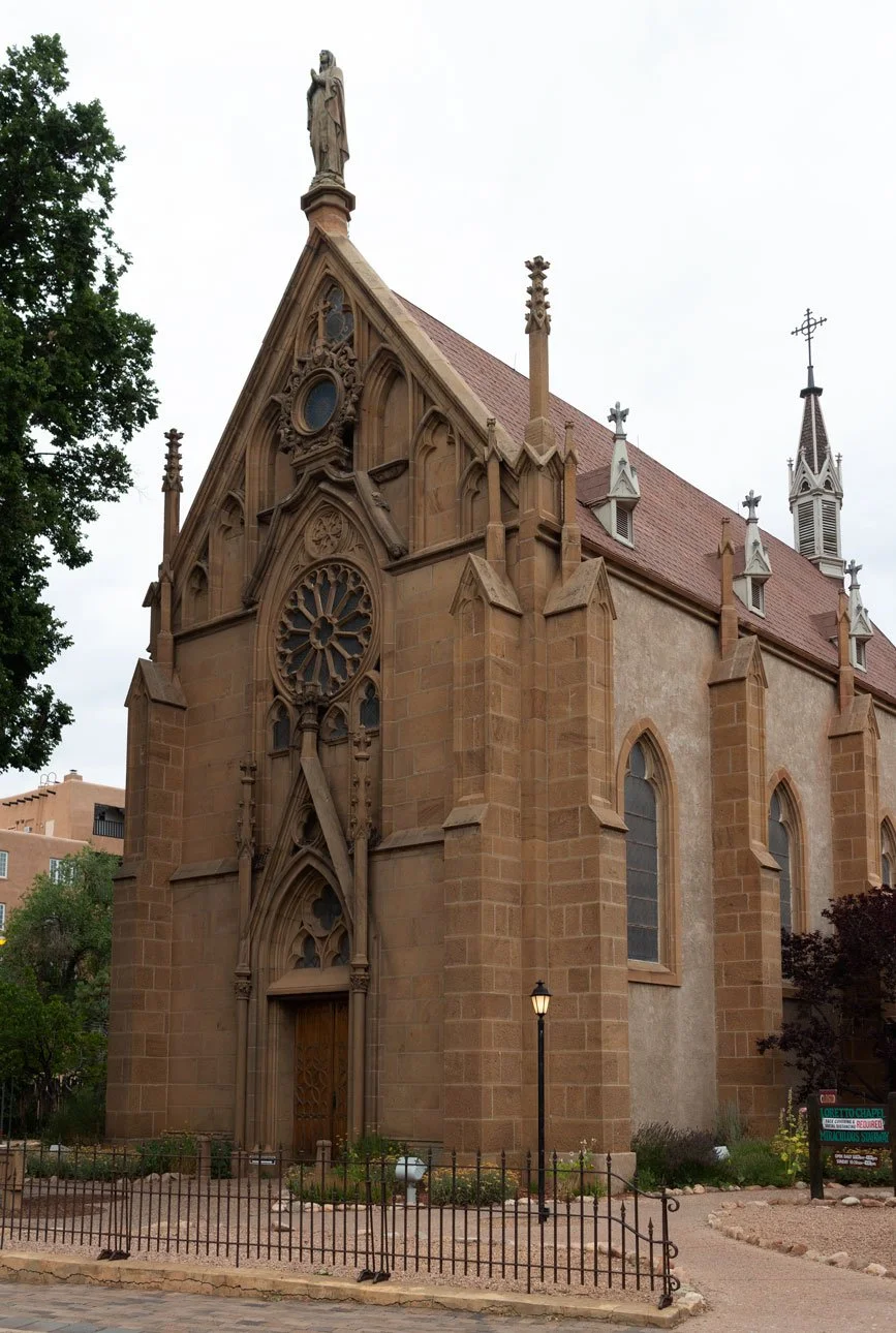 Soon after his arrival in Santa Fe in 1851, Father Jean-Baptiste Lamy sent for the Sisters of Loretto to develop a boarding school for girls in 1853. Completed in 1878, Our Lady of Light Loretto Chapel was designed by Projectus Mouly, the same architect Lamy employed to work on the nearby St. Francis Cathedral. Loretto Chapel is a Gothic Revival Style structure, a reminder of Lamy’s homeland in France. Loretto Chapel’s interior is dominated by an unusual spiral staircase leading to the choir loft. In about 1881, an unknown carpenter volunteered to build the circular staircase, which spirals 360 degrees without a central supporting pole. Today, the Loretto Chapel is owned and maintained by the proprietors of the Inn and Spa at Loretto, who operate it as a private museum.