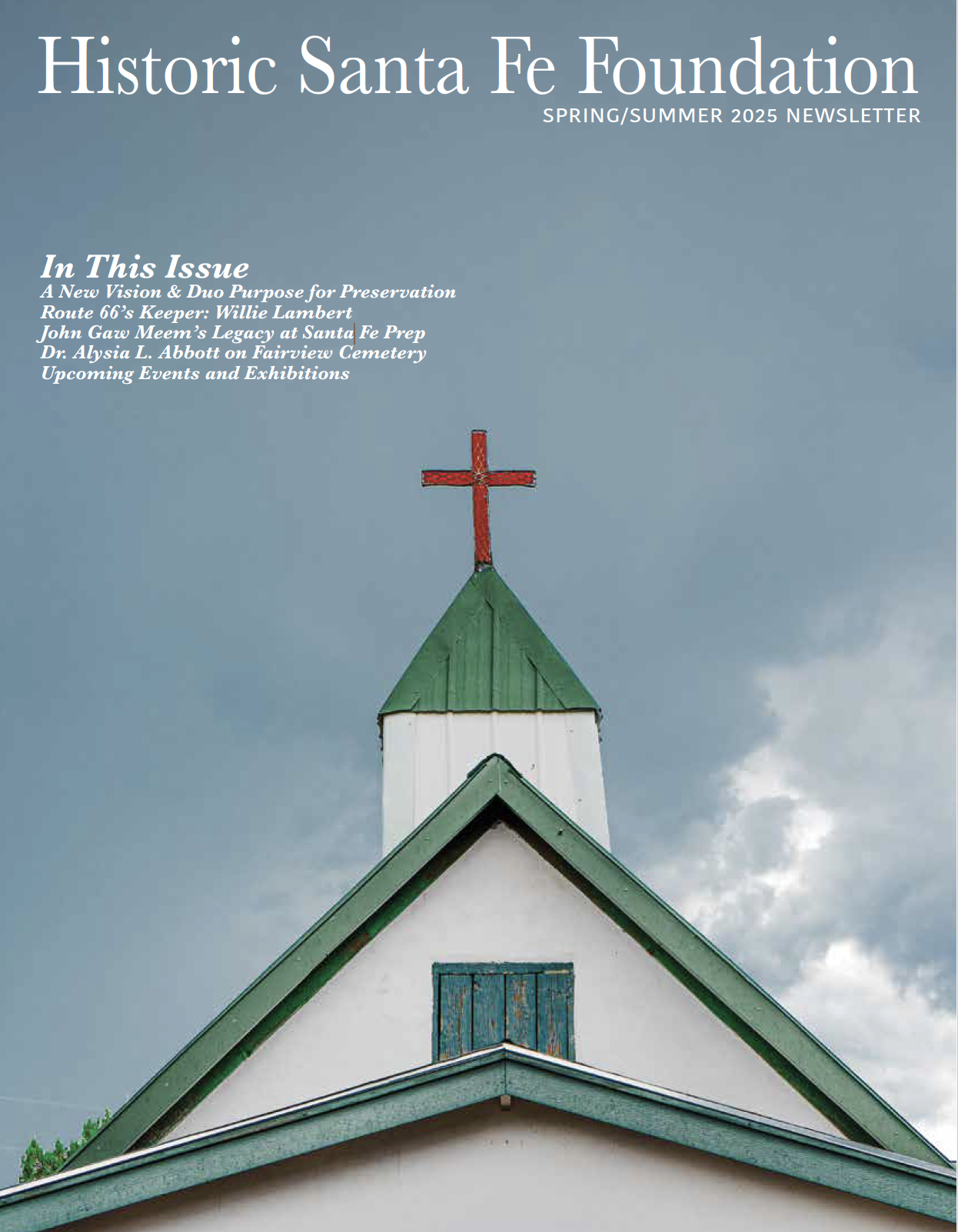 Spring/Summer 2025 - A New Vision & Duo Purpose for Preservation by Dominic Cappello; HSFF’s Endangered Properties Program by Giulia Caporuscio; Route 66’s Keeper: Willie Lambert; Stewards: A History of the Hunt House by J. Walter Sterling; Upcoming Events: Preserving Place Symposium & Rob Martinez Rock’n’Roll in the Garden; Exploring John Gaw Meem’s Architecutral Legacy at Santa Fe Prep by Colette Lee; Exhibition El Zaguán: 2025 Schedule; and Fairview Cemetery by Dr. Alysia L. Abbott.